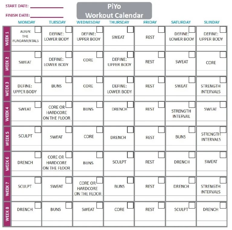 piyo workout calendar piyo workout calendar workout calendar piyo - pin on fitness | printable pdf printable piyo calendar. The piyo calendar is a yoga and pilates workout calendar for 60 days. You're going to love the results and benefits of both . To download the printable piyo workout calendars, simply scroll down, click on the image, and print or save the pdf file. What is my motivation & inspiration? Once you've chosen your main calendar, have a little fun explori.